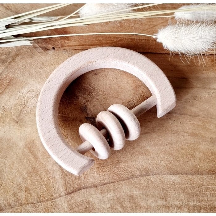 Laat je kleintje duurzaam ontdekken! Deze houten rammelaar is gemaakt van beukenhout. De rammelaar is half rond en er zitten 3 kleine losse ringen om. Deze rammelaar is heel goed vast te houden voor de allerkleinsten.