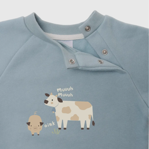 Fijne zachte sweater met leuke print met thema boerderij. Tot en met maat 86/92 hebben de sweaters 2 verborgen drukknoopjes bij de hals zodat de sweater makkelijk aan te trekken is.