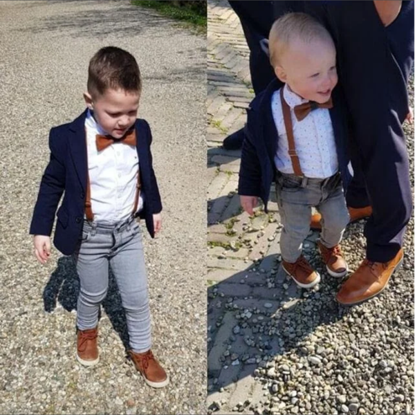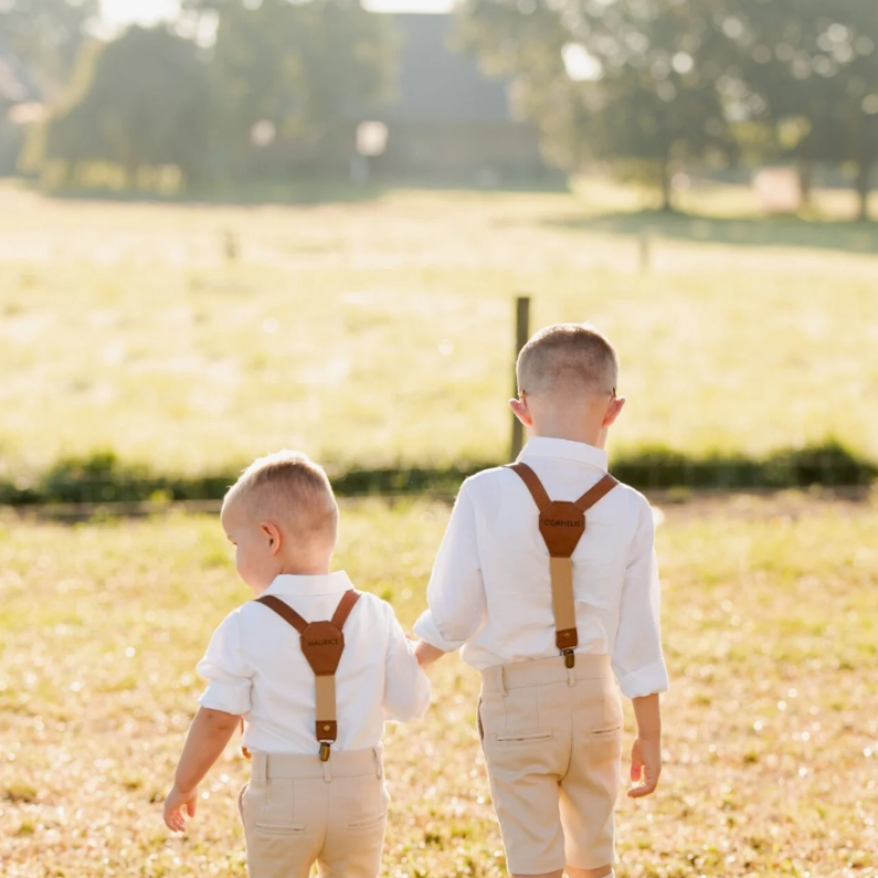 Stoere kinderbretels van leer. Hoe gaaf voor een bruiloft of een ander feestje!? Verkrijgbaar in zwart of bruin (eventueel in gewenste kleur) in 4 maten, bandbreedte is 2cm.