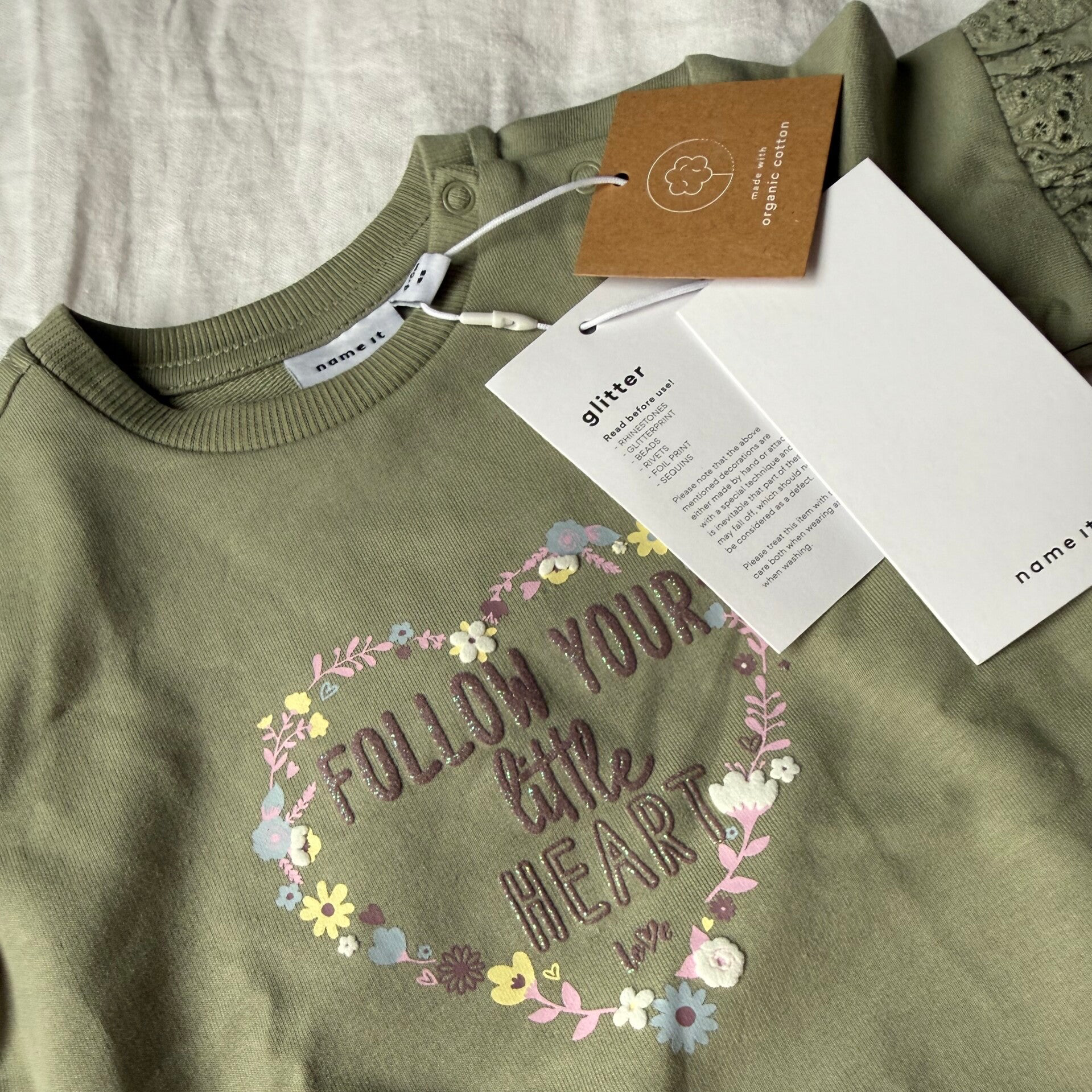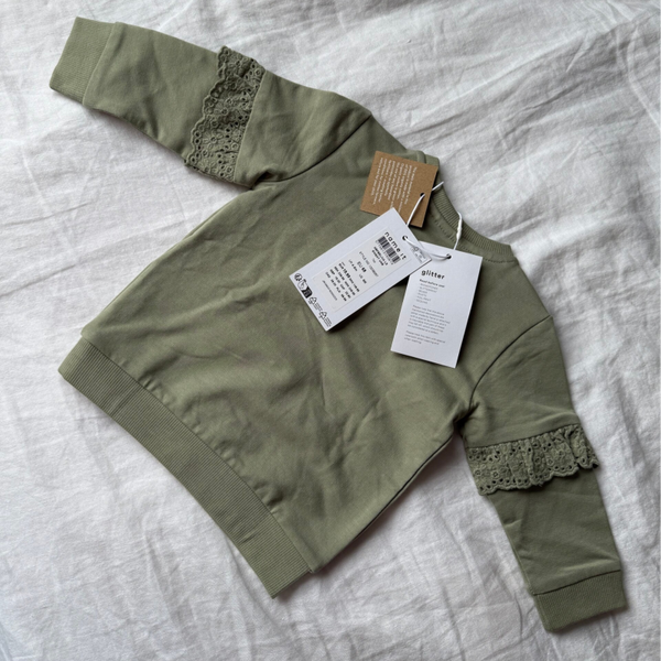 Sweater met mooie print aan de voorzijde met glitters. Ook een leuk extra detail op de mouwen van kant. Net wat anders!