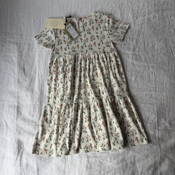 Mooie jurk van goede kwaliteit heeft een print van een vogel met takken/bloemen. Van het merk Lil' Atelier