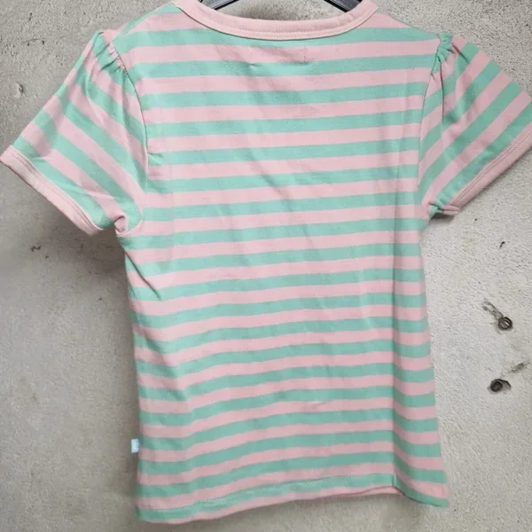 Gestreept t-shirt lichtgroen met roze. Heeft een watermeloen print aan de voorzijde.